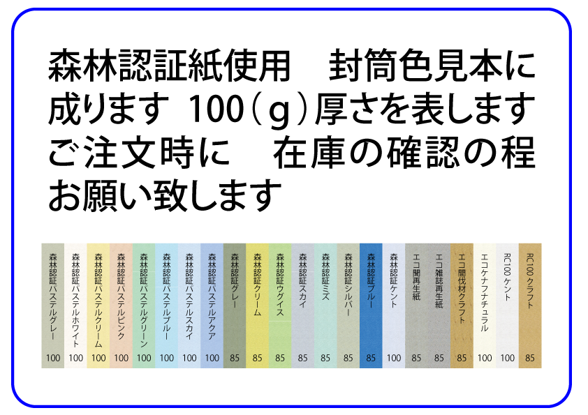 封筒の用紙の色見本及び厚さ(80g85g100g)は、こちらからお選びください